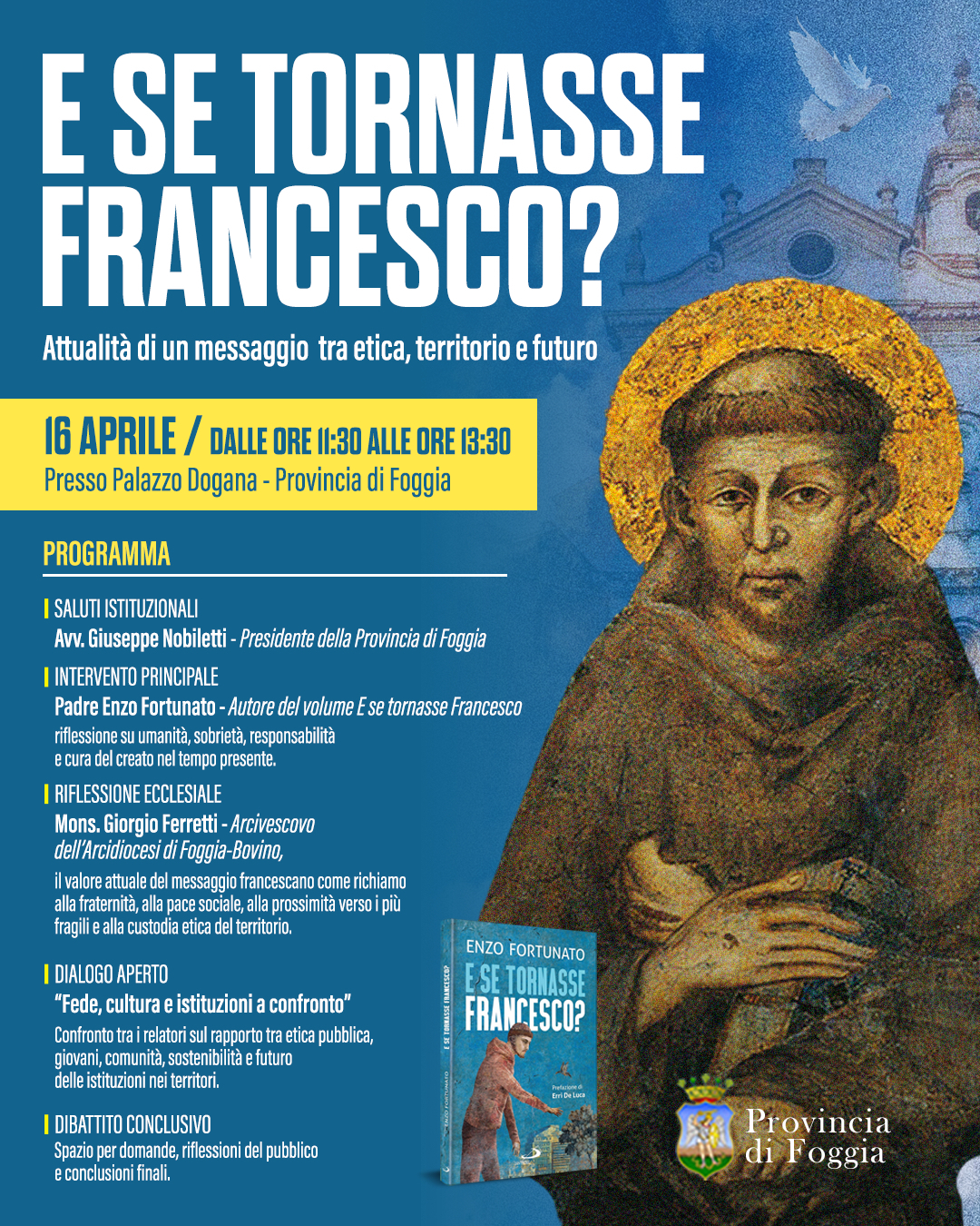 Il momento centrale sarà affidato a Padre Enzo Fortunato autore del volume "E se tornasse Francesco?", che guiderà una riflessione sui valori della sobrietà, dell'umanità e della responsabiltà, riletti alla luce del contesto contemporaneo e delle trasformazioni in atto della società. A seguire, l'intervento di Mons. Giorgio Ferretti, arcivescovo dell'Arcidiocesi di Foggia-Bovino, offrirà una chiave di lettura ecclesiale del messaggio francescano, inteso come richiamo alla fraternità, alla pace sociale e alla prossimità verso le persone più fragili, oltre che alla custodia etica del territorio.
